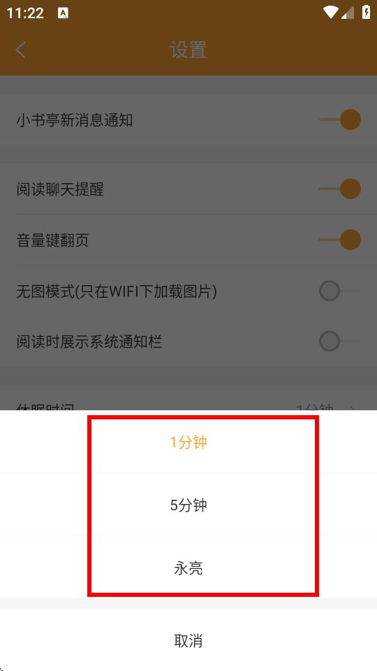 4、在彈出的選擇框中,可以選擇1分鐘,5分鐘,永亮等不同的休眠時間設置,點擊對應選項即可完成設置。