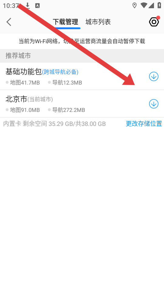 3、進(jìn)入離線地圖的下載管理頁面后,選擇基礎(chǔ)功能包跨城導(dǎo)航必備及目標(biāo)城市如當(dāng)前所在城市的地圖包,點(diǎn)擊對應(yīng)地圖包右側(cè)的下載按鈕,完成地圖數(shù)據(jù)下載。