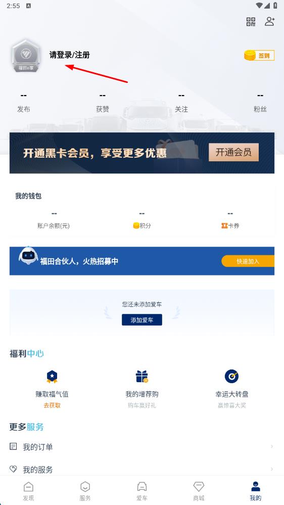 1、打開福田車聯(lián)APP,進(jìn)入“我的”頁(yè)面,點(diǎn)擊上方“請(qǐng)登錄/注冊(cè)”入口,跳轉(zhuǎn)至登錄界面。