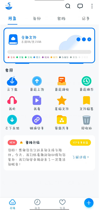 1.存儲:網(wǎng)盤首頁UI全新優(yōu)化,文件分類更清晰,找文件更快更順手。