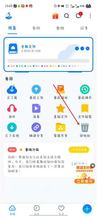 1、打開115網(wǎng)盤APP,點(diǎn)擊回收站選項(xiàng)。