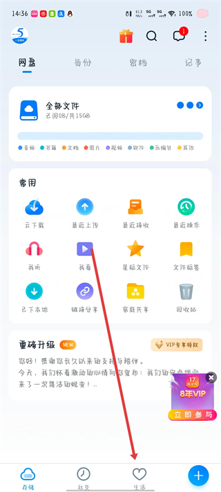 1、打開115網(wǎng)盤,點(diǎn)擊底部的生活選項(xiàng)。