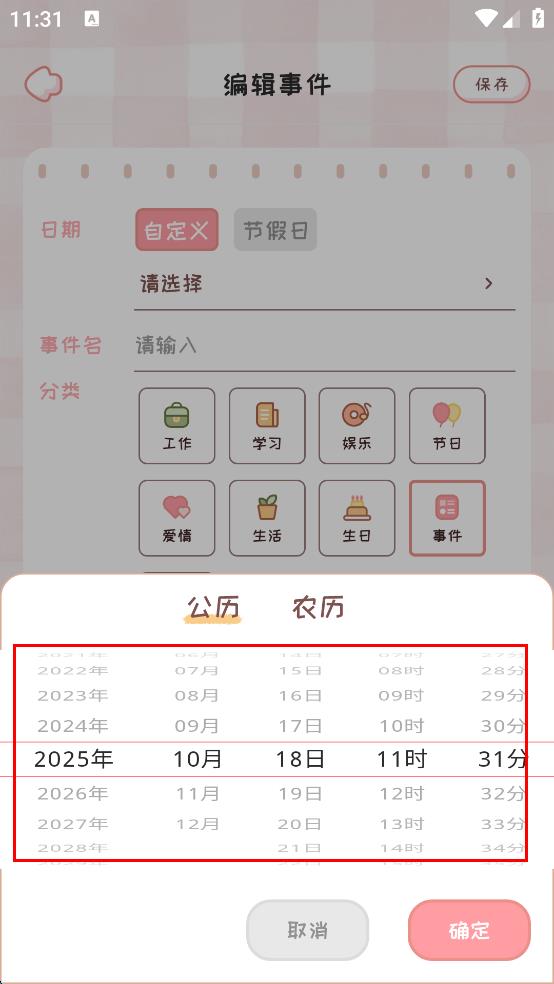 3、在日期選擇窗口中,選擇要記錄事件的公歷或農(nóng)歷日期、時間,然后點擊“確定”。