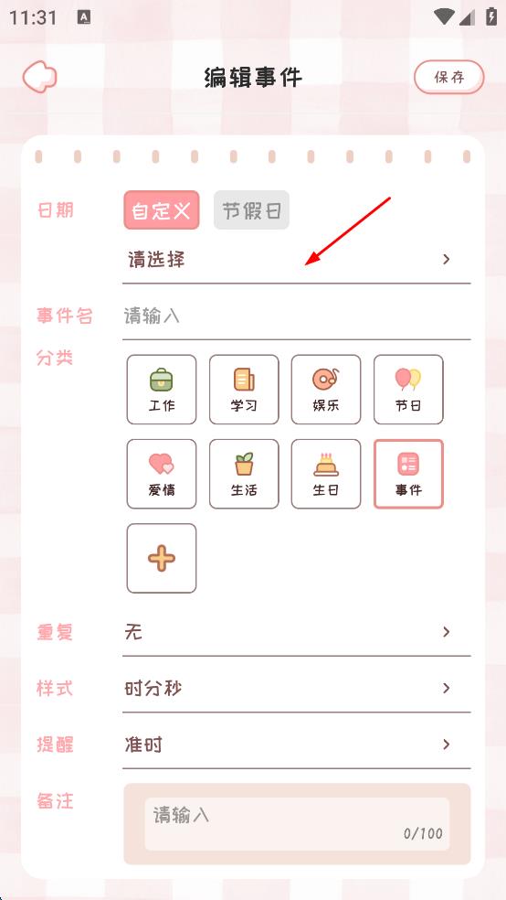 2、在編輯事件界面,點擊“請選擇”日期區(qū)域,彈出日期選擇窗口。