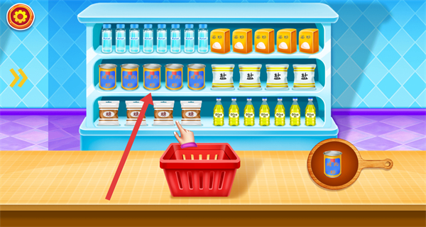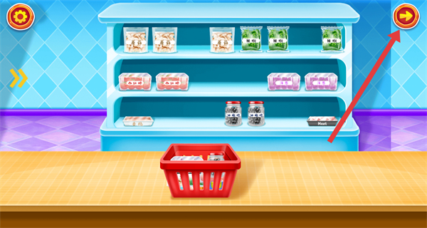 3、在超市內,根據(jù)提示點擊貨架上的材料,將其放入紅色購物籃中。