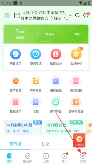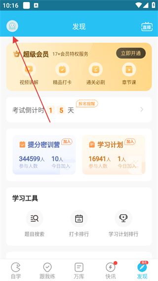 1、打開自考萬題庫APP,進入發(fā)現(xiàn)頁面,點擊左上角的個人頭像。