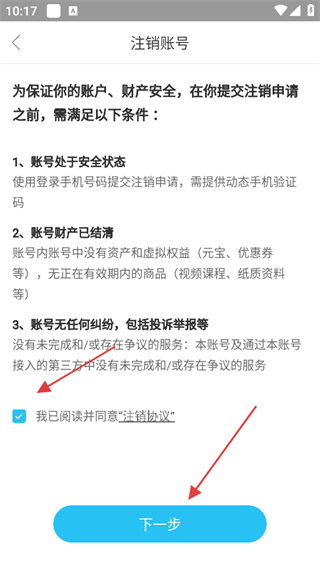 4、在注銷賬號頁面,勾選我已閱讀并同意注銷協(xié)議,點擊下一步。