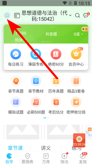 1、在自考萬題庫首頁,點擊左上角頭像圖標,進入個人功能頁面。
