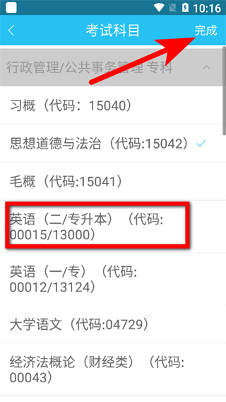 4、選擇英語二/專升本,點擊右上角完成按鈕,即可完成考試科目的選擇。