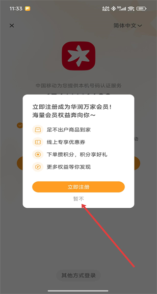 3、登錄后彈出的注冊彈窗點擊“暫不”,關(guān)閉彈窗。