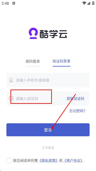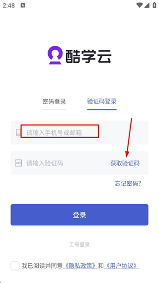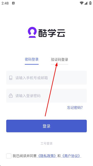 1、打開(kāi)酷學(xué)院APP,在登錄頁(yè)面點(diǎn)擊驗(yàn)證碼登錄選項(xiàng)。