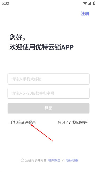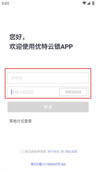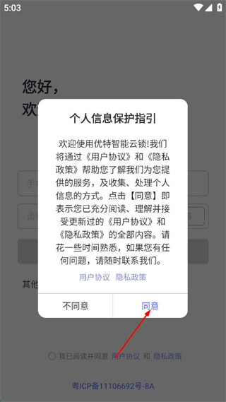 1、在優(yōu)特云鎖APP界面,點擊個人信息保護指引中的同意按鈕。