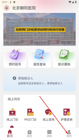 1、在朝陽健康云APP首頁,點(diǎn)擊右下角我的選項(xiàng),進(jìn)入個人中心界面。