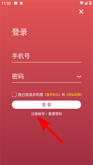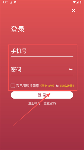 3、在登錄頁面,輸入手機(jī)號和密碼,勾選服務(wù)協(xié)議,點(diǎn)擊登錄按鈕即可登錄賬號。