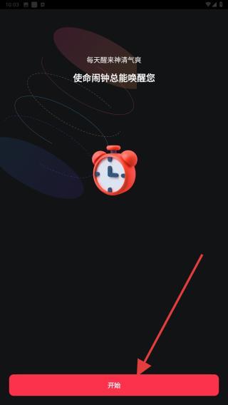 1、打開使命鬧鐘APP,進(jìn)入時(shí)會(huì)彈出該頁面,點(diǎn)擊開始的按鈕。