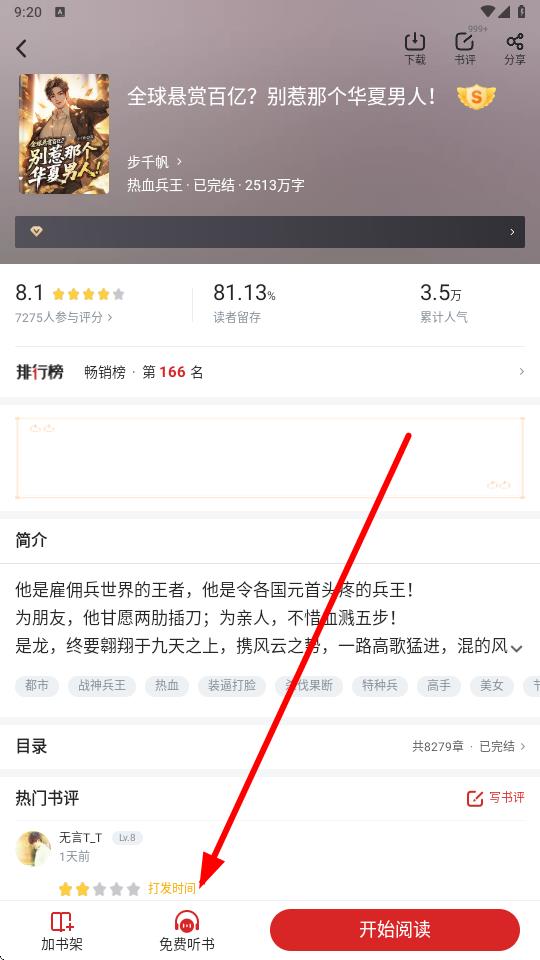 2、在書(shū)城選擇小說(shuō),進(jìn)入小說(shuō)詳情頁(yè)后點(diǎn)擊免費(fèi)聽(tīng)書(shū)。