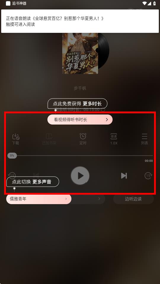 3、進(jìn)入聽(tīng)書(shū)界面,可按需通過(guò)看視頻獲取聽(tīng)書(shū)時(shí)長(zhǎng),還能進(jìn)行定時(shí)、倍速、切換聲音等操作。