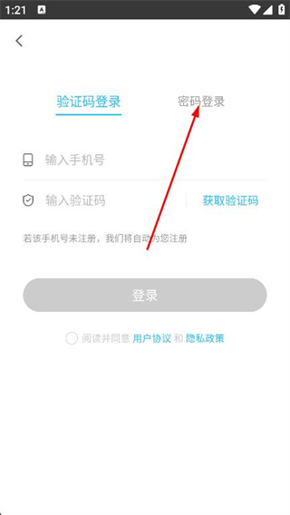 1、打開(kāi)成考萬(wàn)題庫(kù)APP,點(diǎn)擊密碼登錄選項(xiàng)。