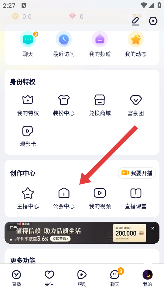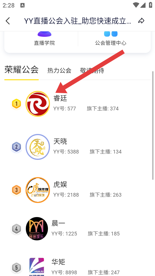 1、進(jìn)入YY我的頁(yè)面后,往下滑找到點(diǎn)擊公會(huì)中心的選項(xiàng),進(jìn)入公會(huì)列表的界面。