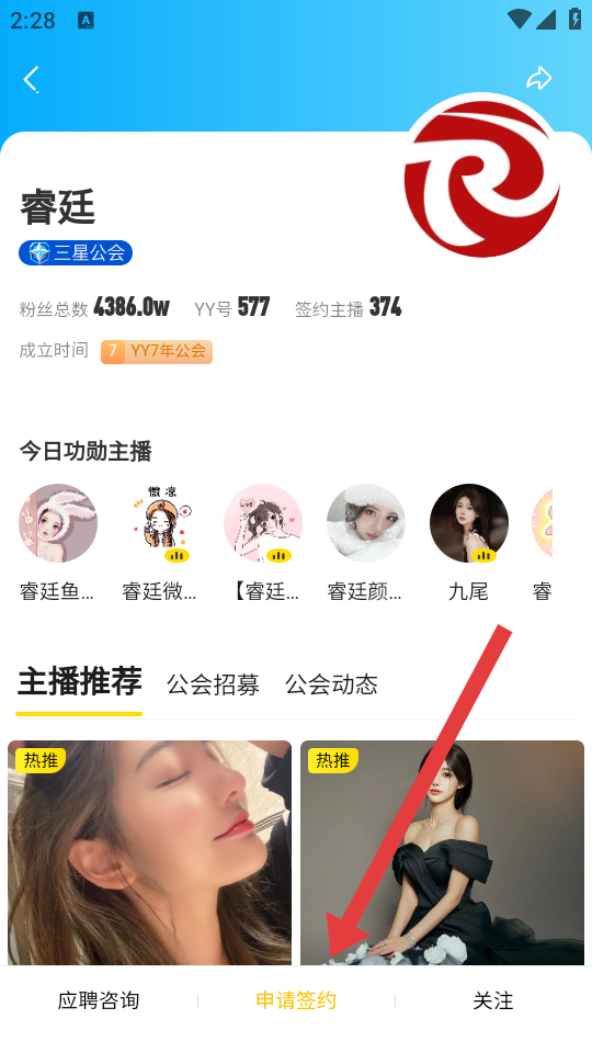3、在這個(gè)公會(huì)的詳情頁(yè)面底部,需要點(diǎn)擊申請(qǐng)簽約按鈕,提交加入公會(huì)的申請(qǐng)。
