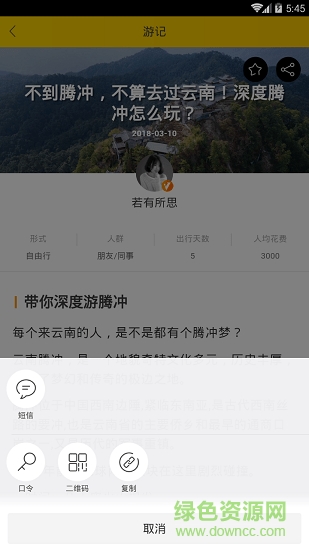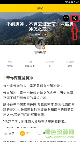 2、然后,我以云南為例,點擊下面的一篇云南旅游攻略,然后點擊右上角的“分享”按鈕,即可進行分享;