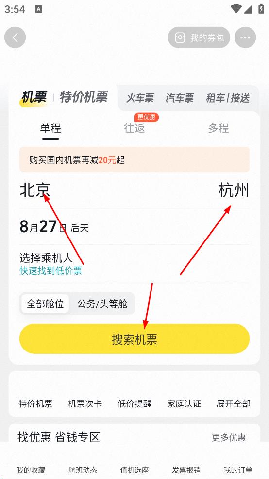 2、在機票預訂頁面,選擇“單程”等類型,分別填入出發(fā)地(如北京)、目的地(如杭州)及出行日期。