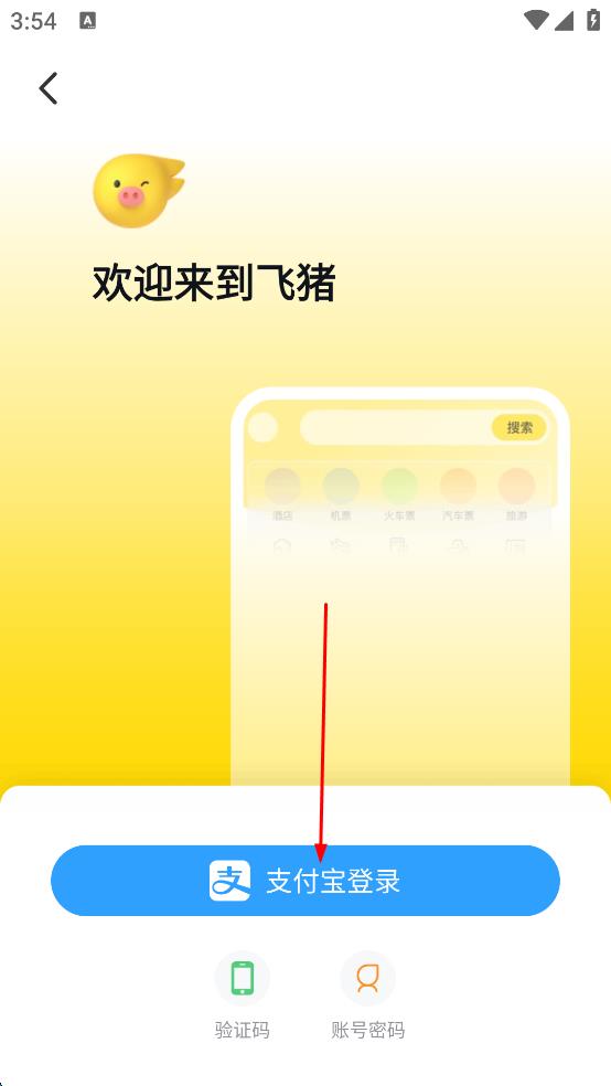 1、打開飛豬APP,點擊“支付寶登錄”完成賬號登錄,進入首頁后找到“機票”功能入口并點擊。