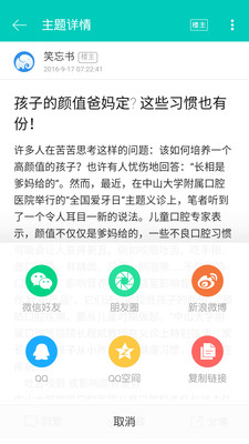 看到有意思的內(nèi)容,直接通過(guò)“一鍵分享”功能分享給朋友吧。微博、朋友圈、qq好友、短信甚至郵件,朋友在哪里,就能分享到哪里。