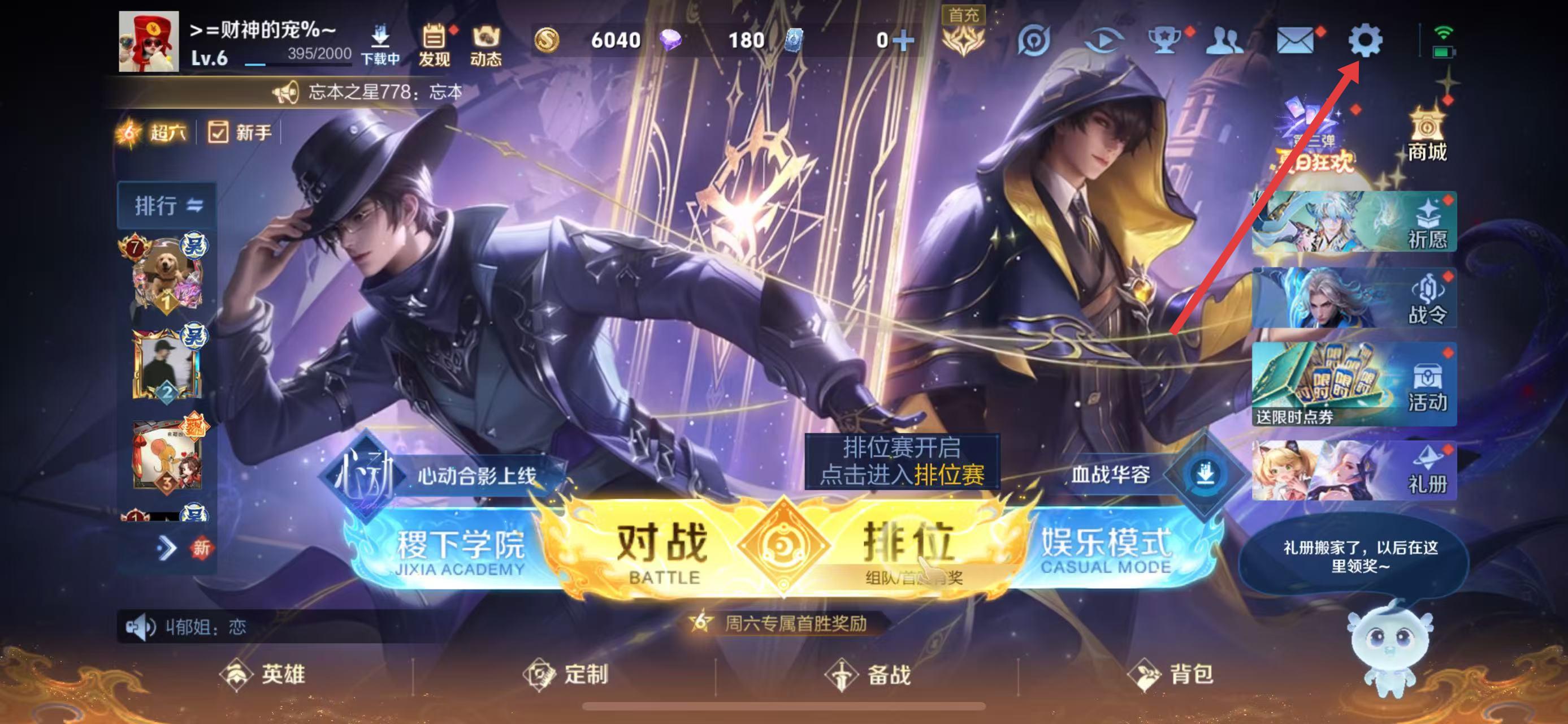 1、打開(kāi)王者榮耀游戲,在游戲主界面點(diǎn)擊右上角的設(shè)置圖標(biāo),進(jìn)入設(shè)置頁(yè)面。