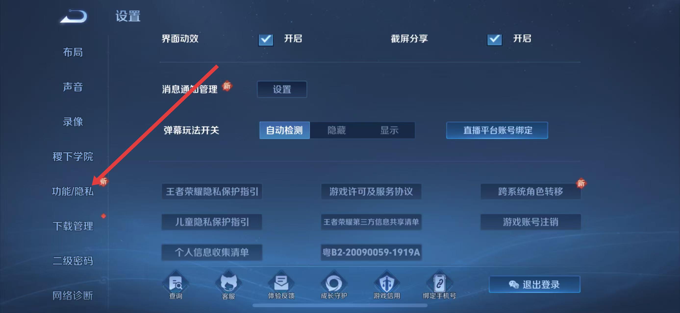 2、在設(shè)置頁(yè)面中,點(diǎn)擊左側(cè)列表里的功能/隱私選項(xiàng),進(jìn)入功能隱私設(shè)置界面。