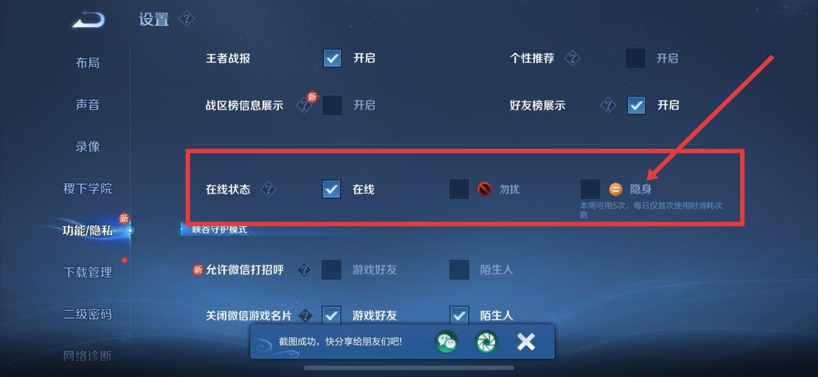 3、在功能隱私設(shè)置界面,找到在線(xiàn)狀態(tài)一欄,點(diǎn)擊隱身選項(xiàng),即可將自己的游戲在線(xiàn)狀態(tài)設(shè)置為隱身。