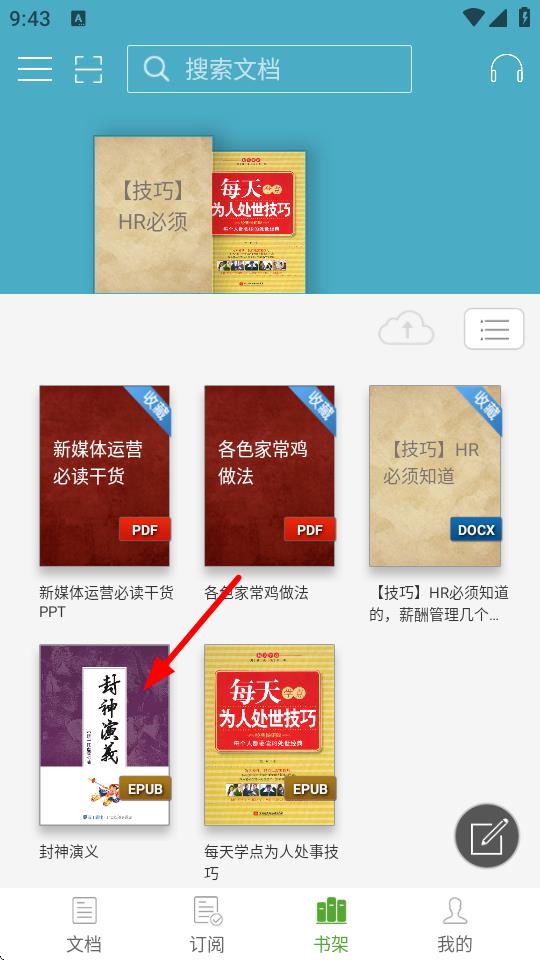 1、打開豆丁書房應(yīng)用,進(jìn)入書架頁(yè)面,點(diǎn)擊想要閱讀的文檔,比如封神演義。