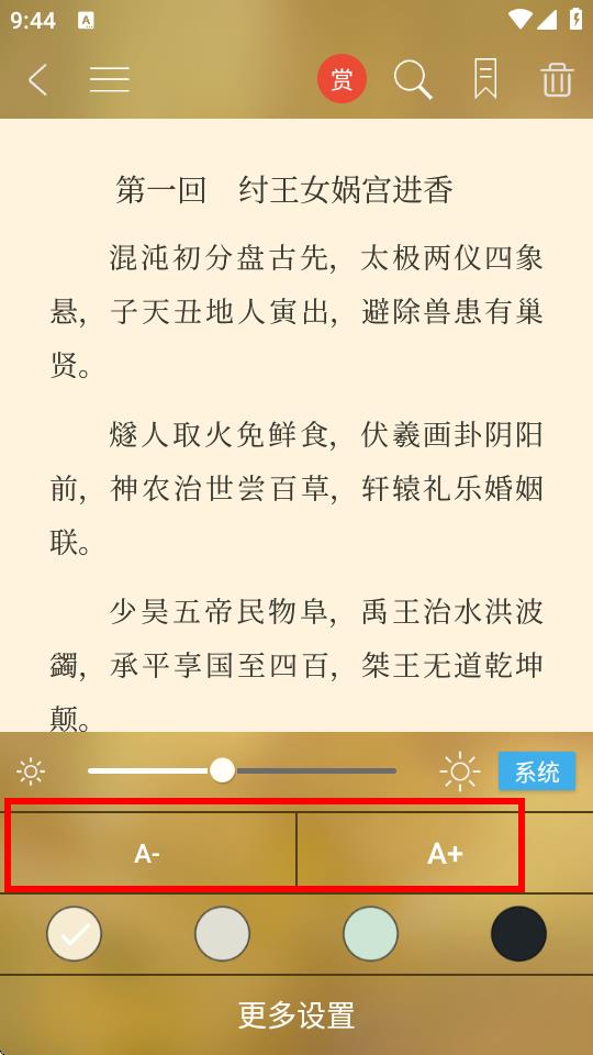 4、在彈出的設(shè)置界面中,點(diǎn)擊A-或A+按鈕,即可減小或增大文檔的字體大小。
