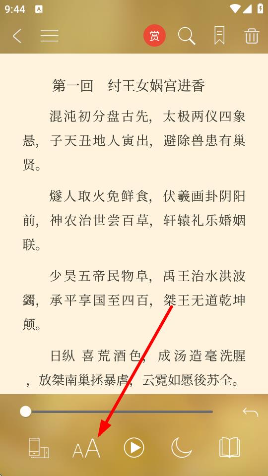 3、在正文閱讀界面中,點(diǎn)擊底部功能欄里類似AA的圖標(biāo),調(diào)出字體設(shè)置選項(xiàng)。
