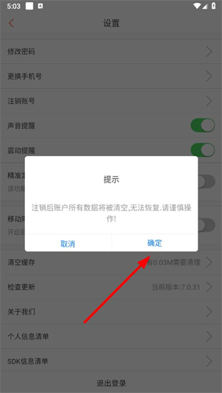 4、在彈出的提示框中,點擊確定按鈕,按照提示完成賬號注銷操作。
