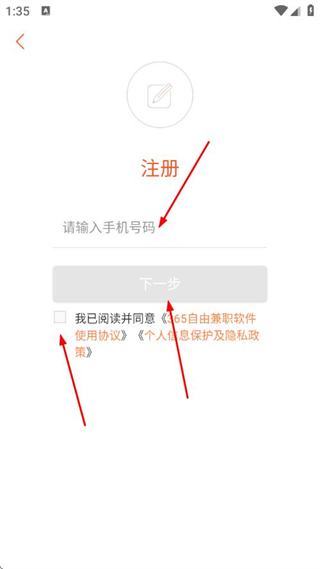 2、在注冊頁面輸入手機號碼,勾選協(xié)議,點擊下一步。