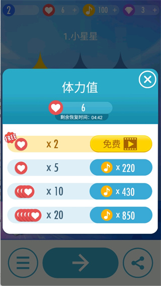 每局游戲需要一點體力,每隔10分鐘會獲得1點體力。