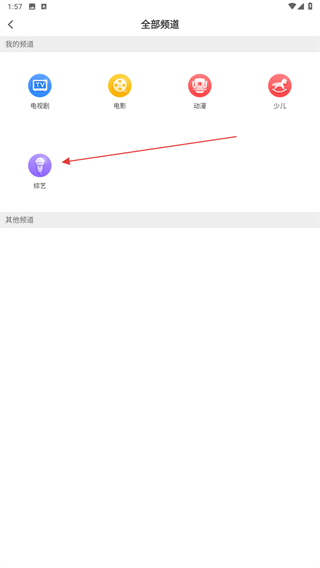 2、在全部頻道的頁(yè)面內(nèi),用戶需點(diǎn)擊下方綜藝的按鈕。