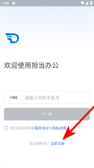 1、打開擔(dān)當(dāng)辦公APP,在歡迎頁面我們需要點擊立即注冊的按鈕。