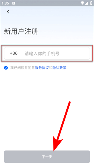 2、進入新用戶注冊頁面,輸入手機號,點擊下一步。