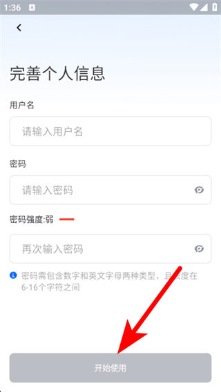 4、進入頁面輸入用戶名等信息后點擊開始使用,完成賬號注冊操作。