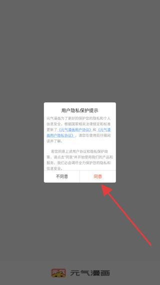 1、打開(kāi)元?dú)饴?huà)APP,進(jìn)入時(shí)會(huì)彈出用戶隱私保護(hù)提示,點(diǎn)擊同意的按鈕。