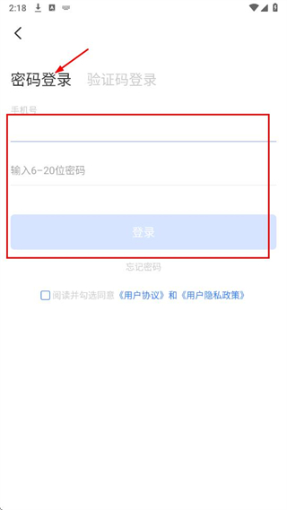 2、若選擇密碼登錄,在登錄頁面輸入手機號和6-20位的密碼,點擊登錄。