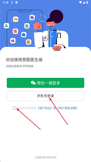 1、打開慧醫(yī)醫(yī)生端APP,勾選用戶協(xié)議和用戶隱私政策,點擊手機號登錄選項,進入登錄頁面。
