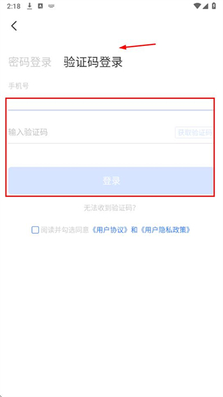 3、若選擇驗證碼登錄,輸入手機號,點擊獲取驗證碼,填入驗證碼,點擊登錄即可。