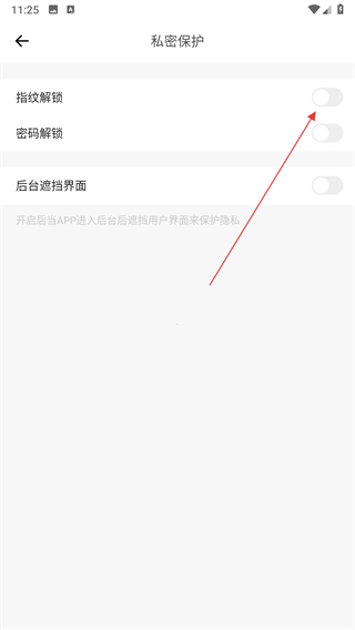 4、在私密保護(hù)頁面,點(diǎn)擊指紋解鎖的開關(guān)。