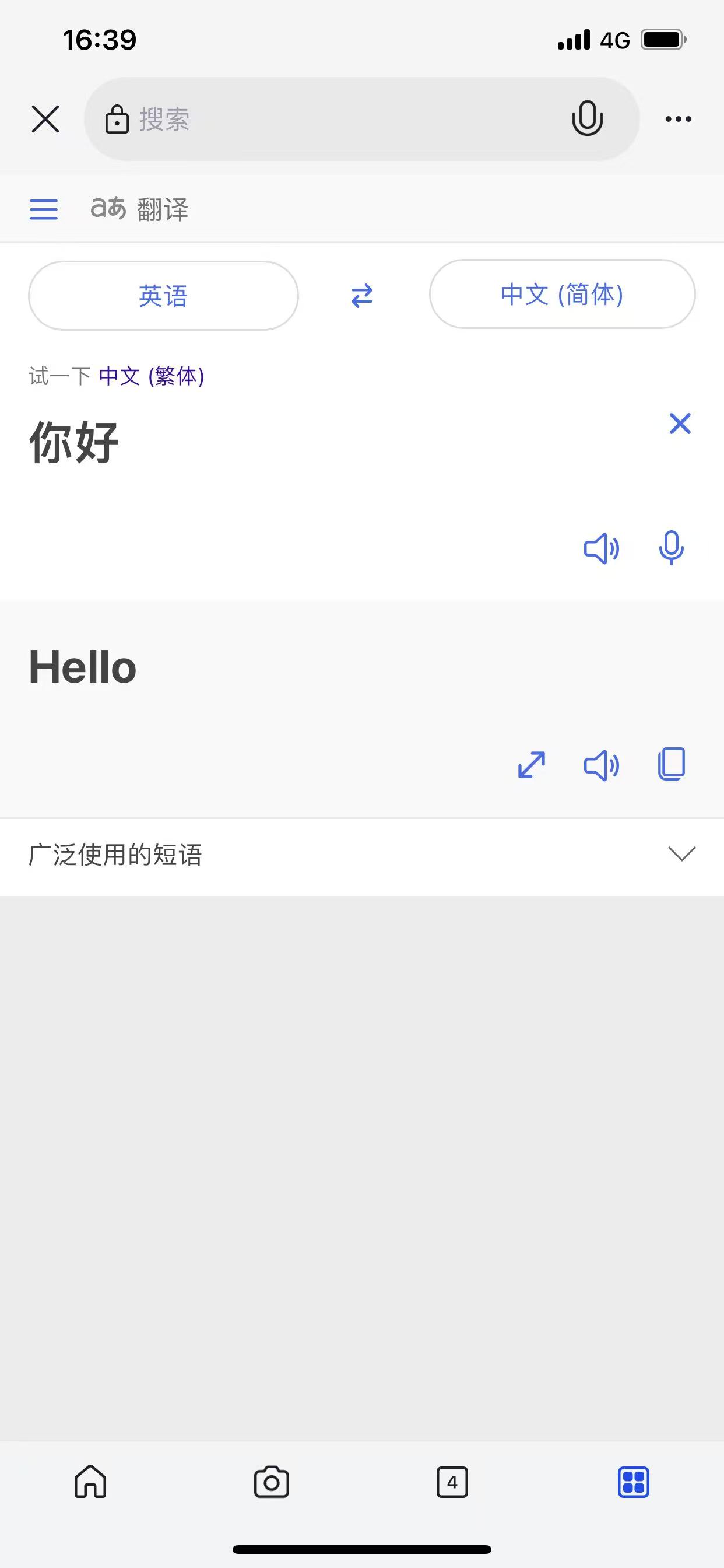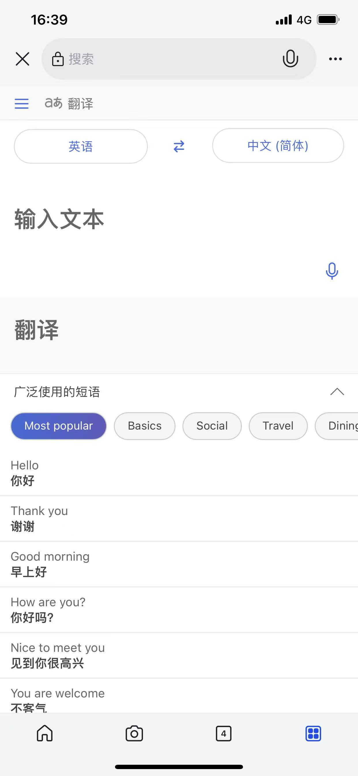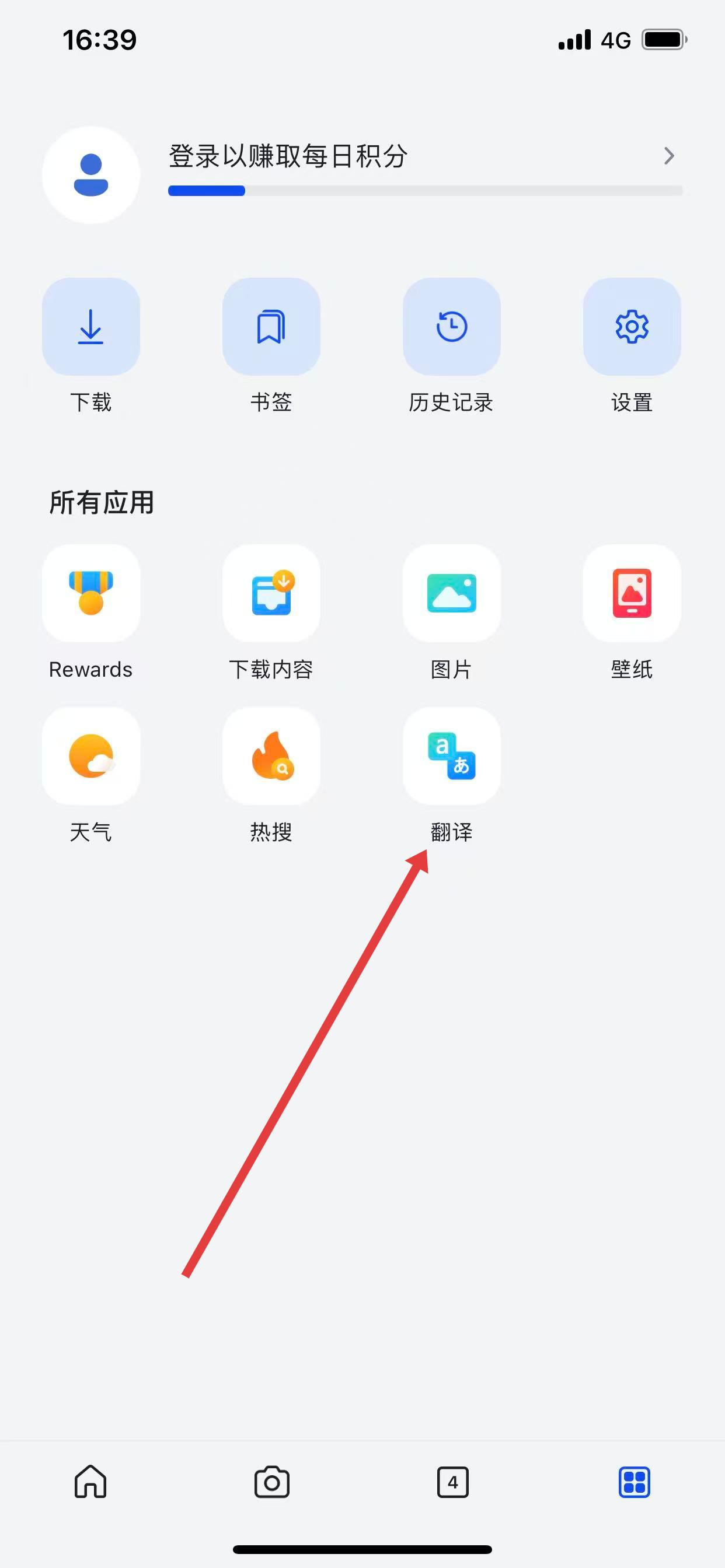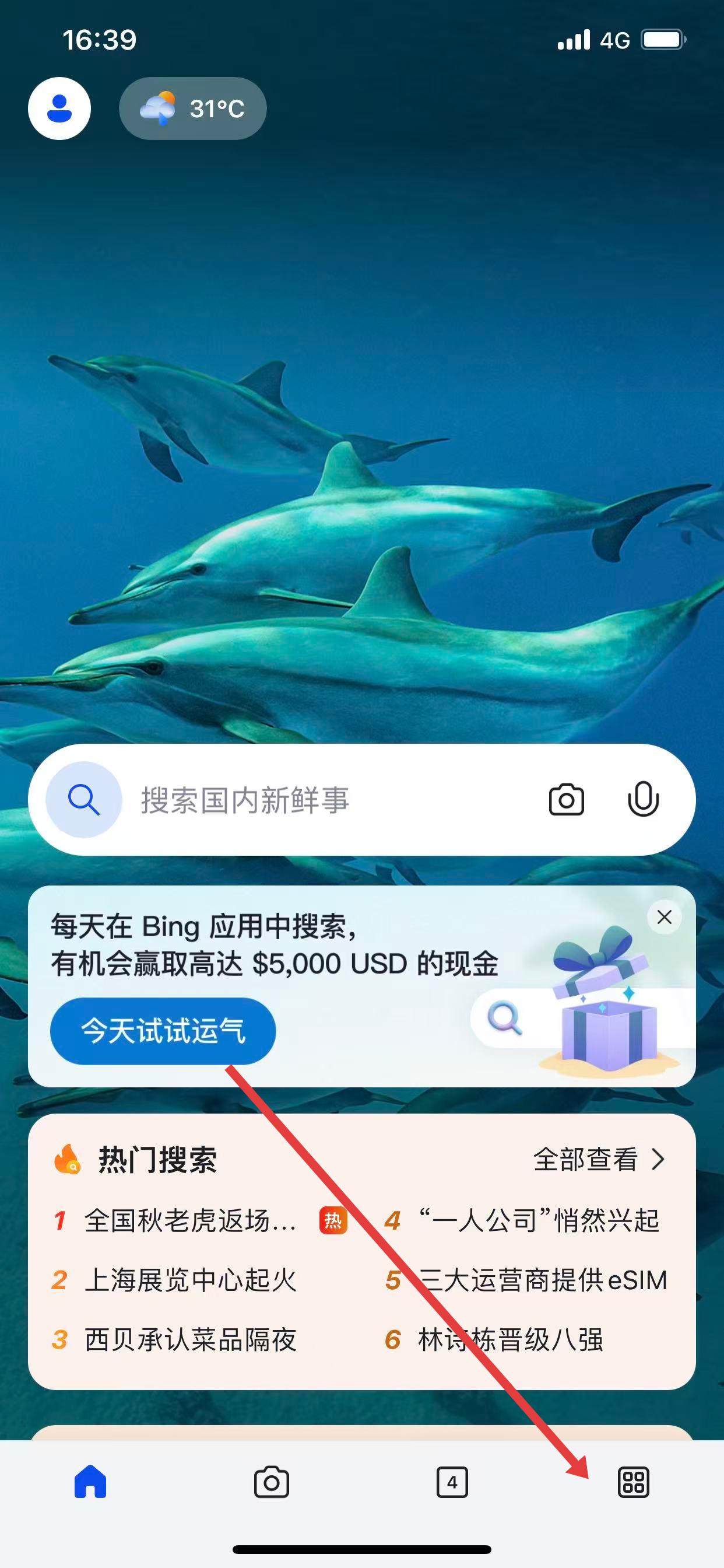 1、打開微軟必應(yīng)應(yīng)用,點(diǎn)擊底部導(dǎo)航欄右側(cè)類似九宮格的應(yīng)用圖標(biāo)。