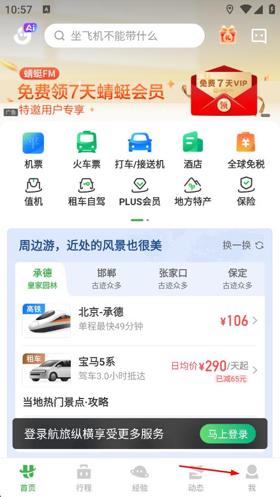 1、打開航旅縱橫APP,進(jìn)入首頁后,點擊頁面右下角“我”的按鈕。
