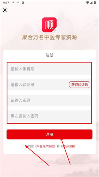 3、輸入手機(jī)號、驗證碼,設(shè)置密碼,再次確認(rèn)密碼,勾選協(xié)議,點(diǎn)擊注冊。