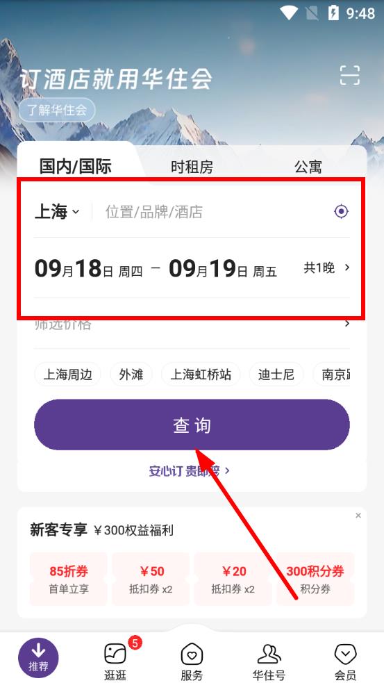 1、打開華住會(huì)App在主界面選擇國內(nèi)/國際等類型,并選擇入住城市如上海,設(shè)定入住及離店日期后點(diǎn)擊查詢。